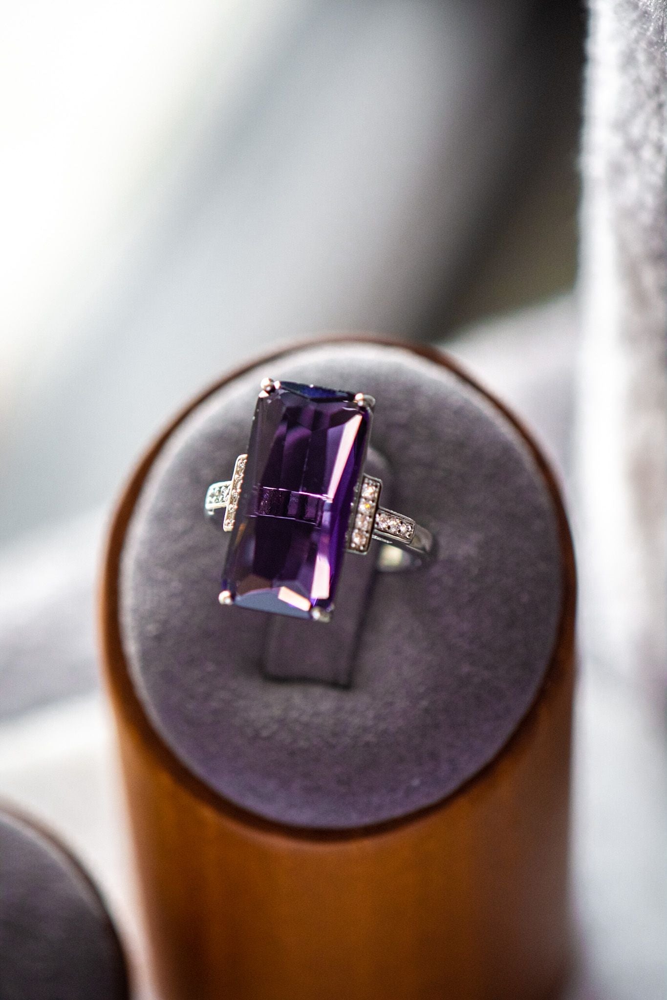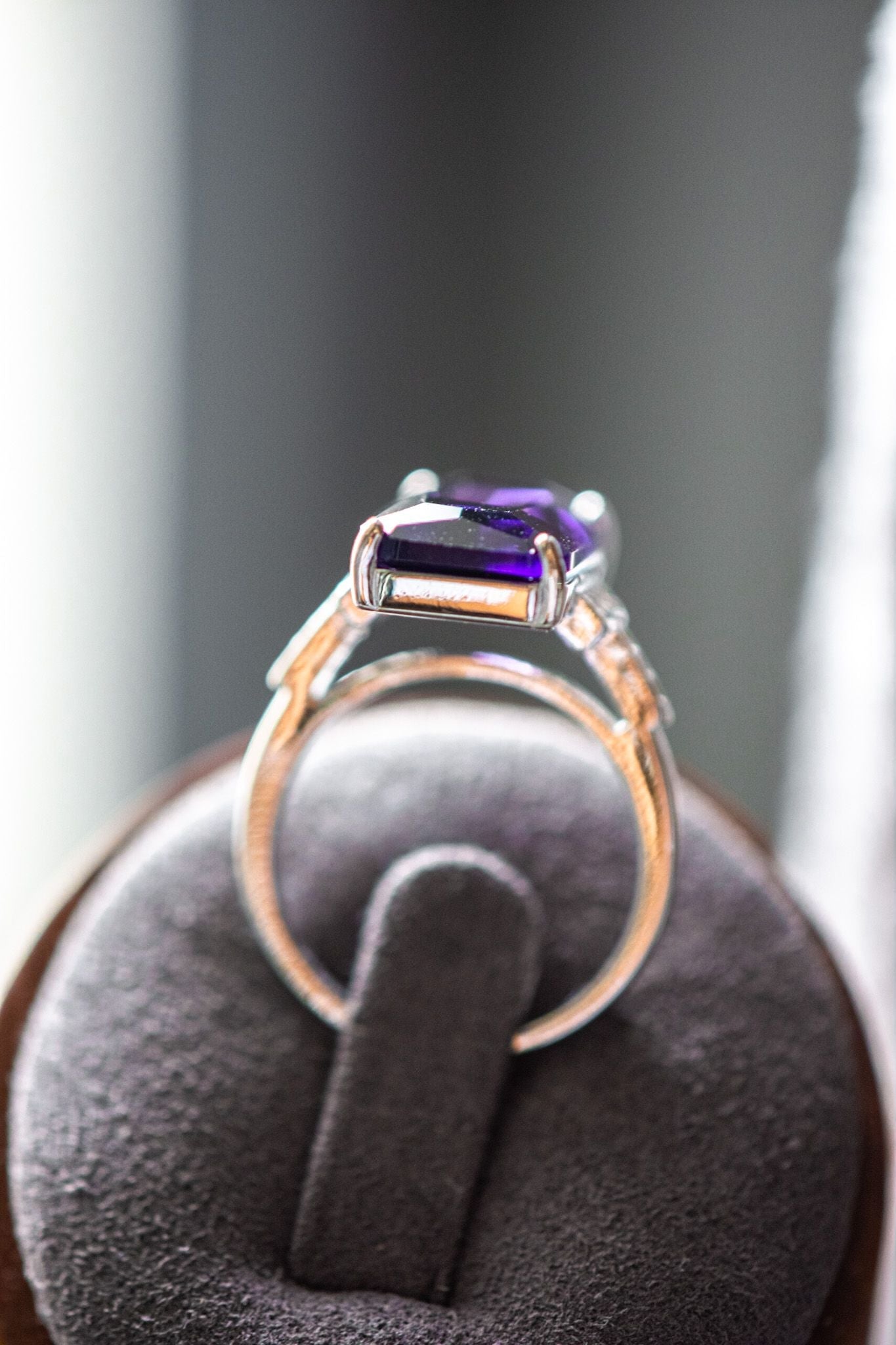 The Isla Emerald Cut Amethyst Sterling Silver Ring is a beautiful and elegant piece of jewelry that features a stunning emerald-cut amethyst stone set in high-quality sterling silver. The stone is held in place by four prongs that add to the overall beauty and durability of the ring. Its unique design and timeless beauty make it a perfect choice for any occasion.