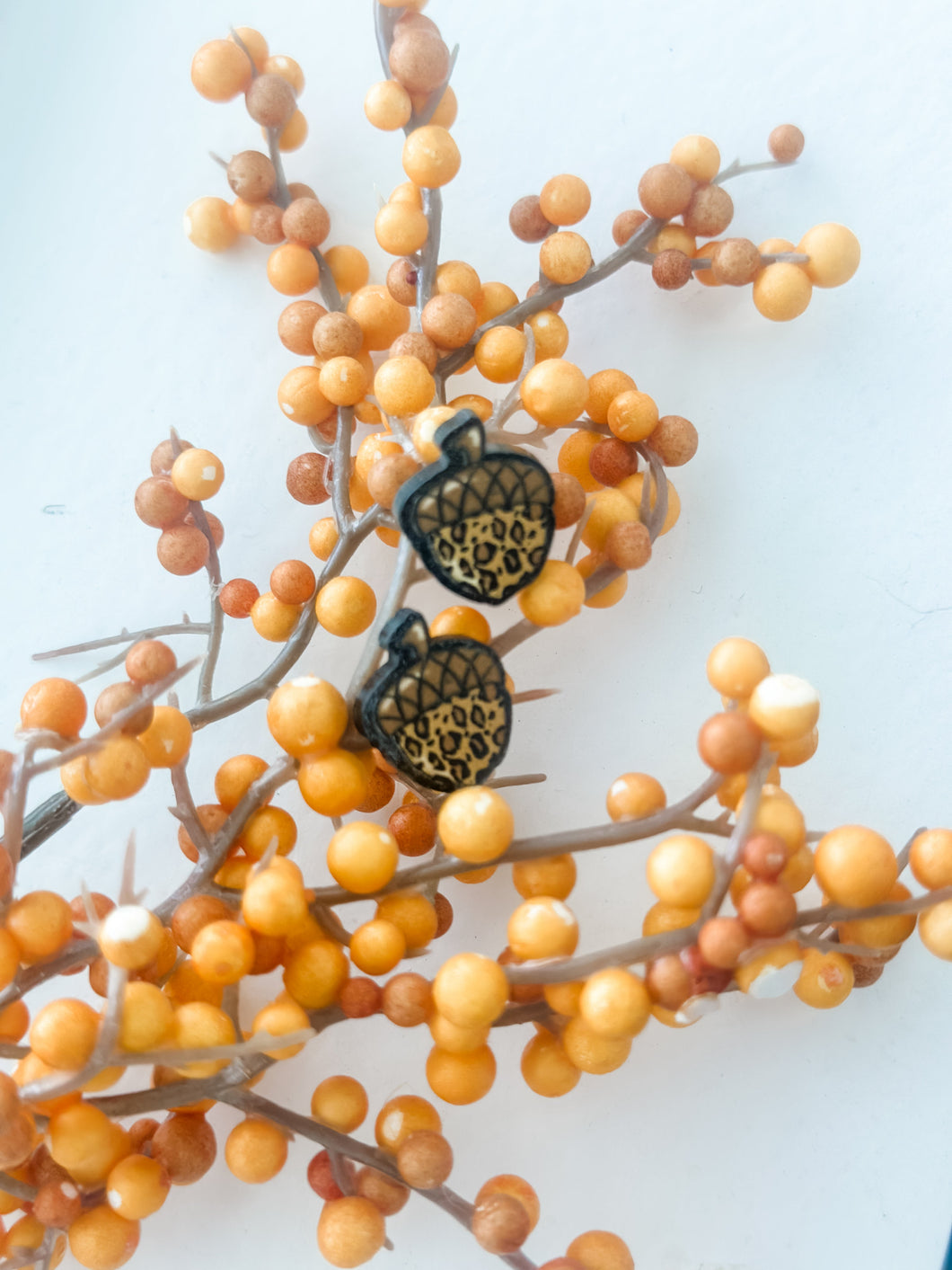 These adorable studs are crafted from high-quality acrylic and hypoallergenic titanium steel, ensuring that they are not only lightweight and comfortable to wear but also safe for sensitive ears. Measuring approximately 3/4", these earrings feature a delightful leopard print on the bottom half of each acorn, making them a unique and trendy statement piece that you can wear all season long.
