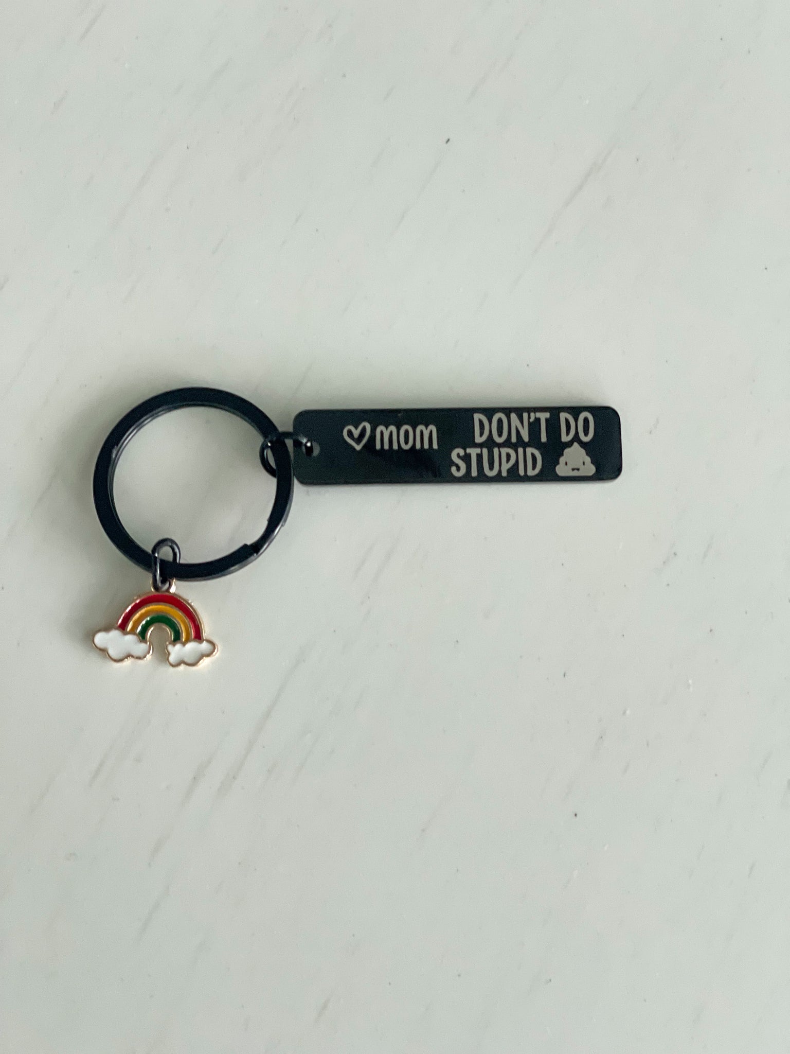 This black keychain says Don't Do Stupid (poo emoji) - (heart emoji) mom